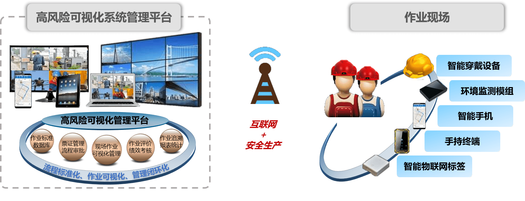 高风险可视化管理平台为企业基于公有云或私有云的全IP架构的“云+端”综合管理平台,以及具有定位、感知、预警和音视频通讯功能的一体化智能穿戴产品,解决安全生产现场作业过程中的问题,实现感知、分析、服务、指挥、监管“五位一体”,打造“互联网+”时代的智慧化管理、精细化管理、过程结果并重的安全生产管理新模式。