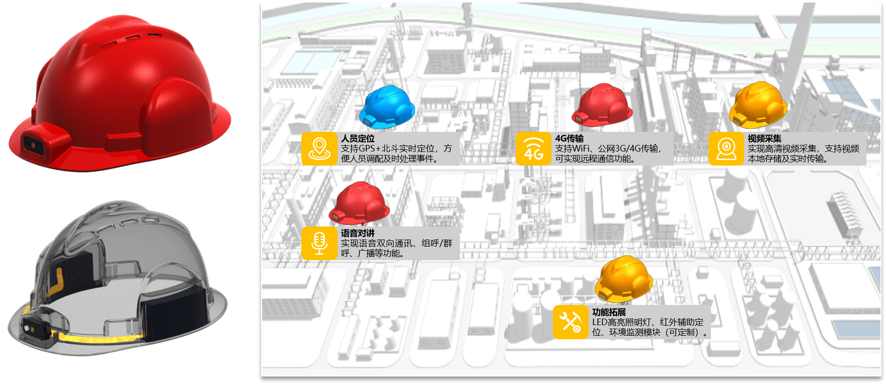 以保障现场作业安全为核心,智能安全帽在满足人员的安全防护需求、解放人员双手的同时,能以第一视角采集、记录、监护等