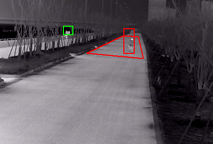 在画面中设定相应的警戒区域,当有物体进入到警戒区域中并在区域内徘徊或者停留时,将触发区域入侵报警规则,热成像摄像机会立即发出报警信号。